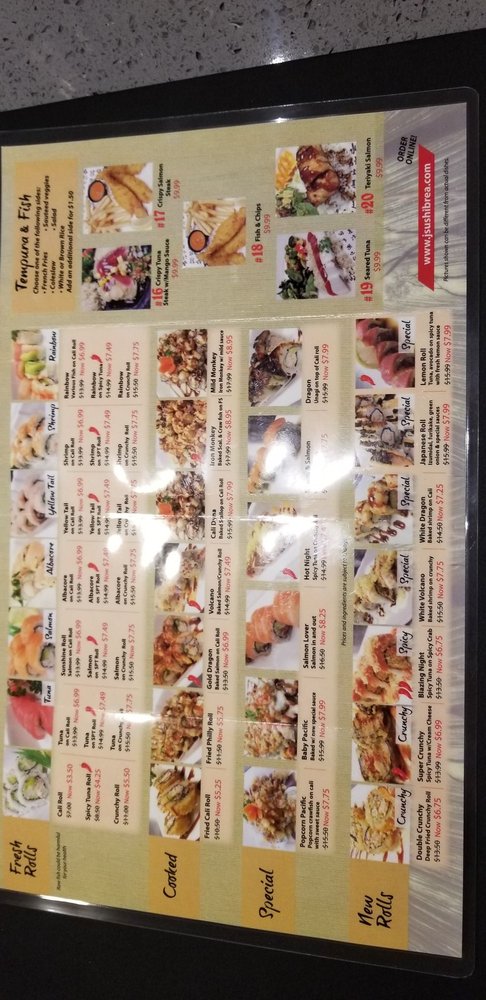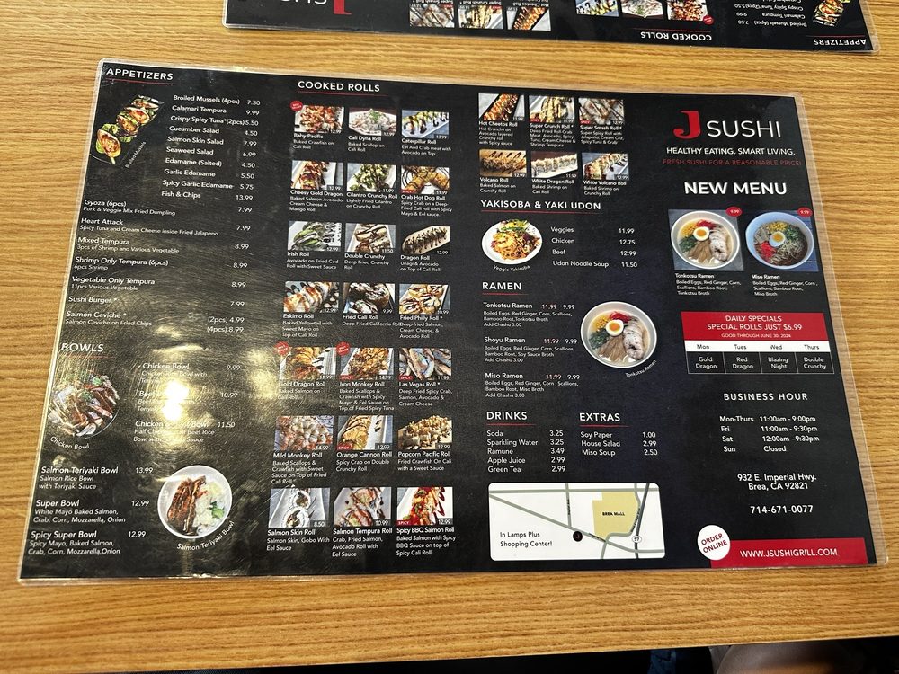 Introducing J Sushi Brea, a sushi bar in Brea, CA, known for its delectable sushi rolls and Japanese dishes. With options for vegans and vegetarians, this restaurant offers a diverse menu with a casual yet classy atmosphere. Customers praise the fresh and affordable sushi, along with the friendly staff and quick service. The daily and monthly specials make dining here a great value for money. Whether you're looking for a quick lunch or a special dinner treat, J Sushi Brea is a go-to spot for sushi lovers. The restaurant's location, ample parking, and attentive service ensure a pleasant dining experience. Don't miss out on the special rolls like the spicy tuna with cilantro and onions or the golden dragon. Experience a burst of umami goodness and embark on a flavorful journey at J Sushi Brea.
